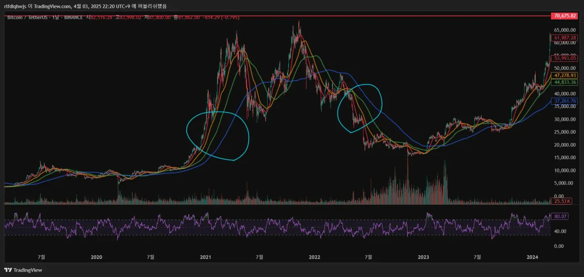 첫번째 사진 동그라미 표식은 이동평균선이 정배열과 역배열되었을때 추세 그대로 상승 및 하락을 확인이 되었습니다
