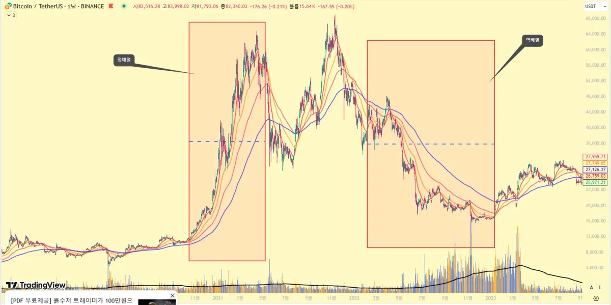 이동평균선이 정배열 되면서 가격이 급격하게 상승하는 것을 볼 수 있고, 또한 역배열이 되면서 크게 하락하는 것을 볼 수 있었습니다.