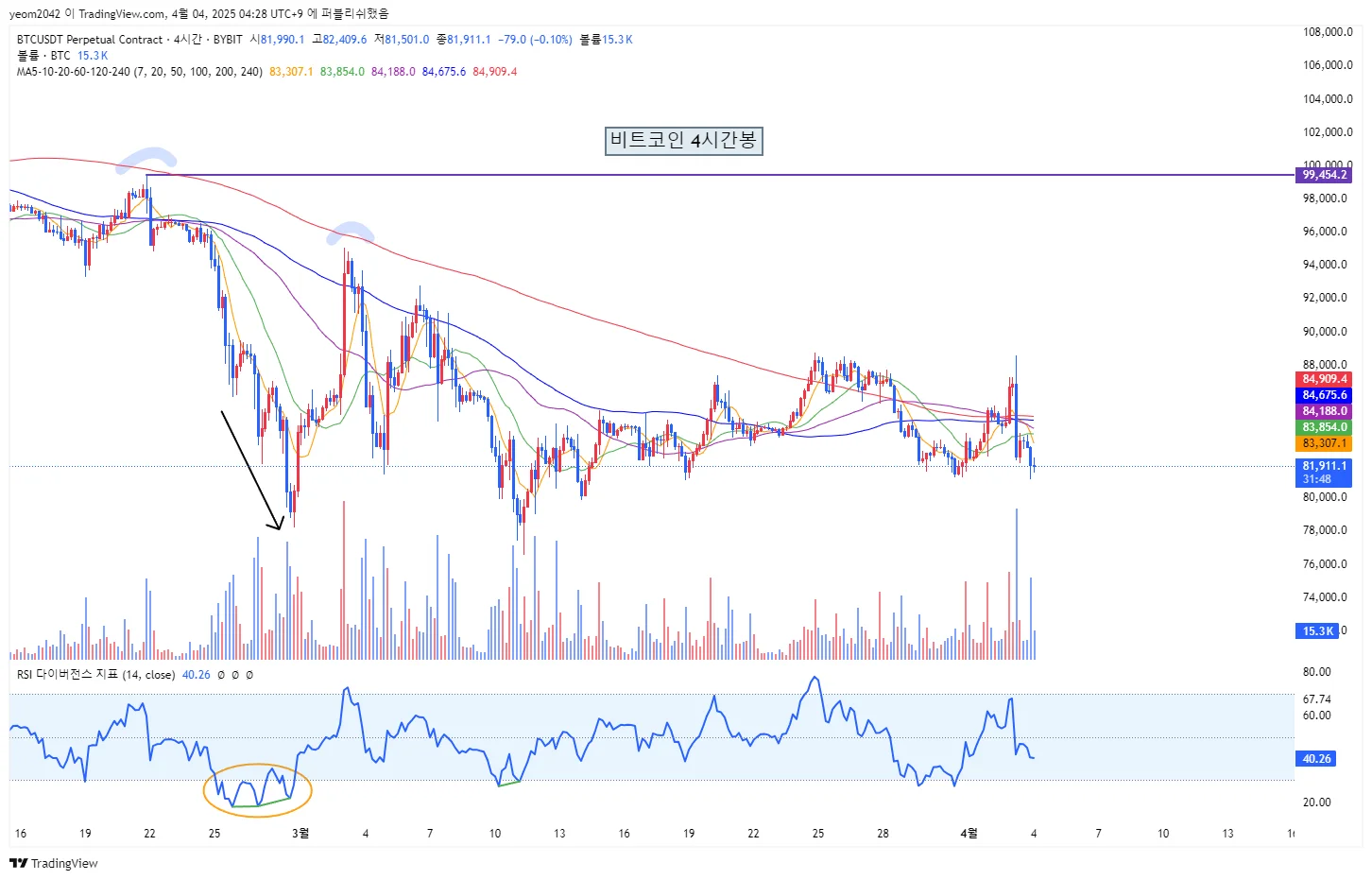 4시간봉상에서 비트는 하락 이후 더블 상승다이버전스에 걸리면서 급격한 가격 상승이 있었지만 이평선들이 전부 역배열인 상태라 결국 200일 이평선을 닿지않고 재차 하락하는 모습입니다.