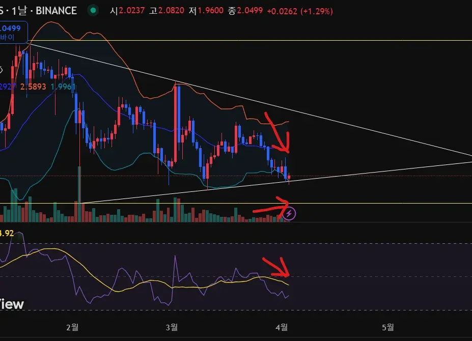 가격 하락 + 거래량은 약하게 증가 + RSI 하락으로