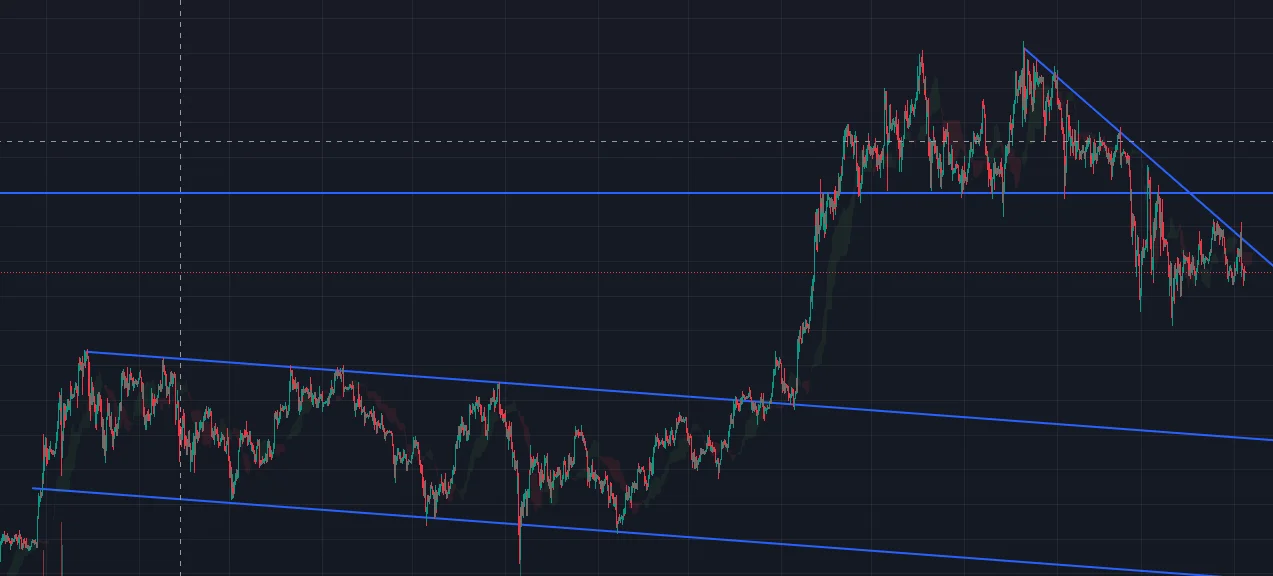 아래 박스권?(기울어져 있어서 맞는지는 모르겠지만)에서 물량 매집후 올려서 여러번 저항을 받다가 저항이 깨지면서 하락 추세로 바뀐것으로 보입니다.