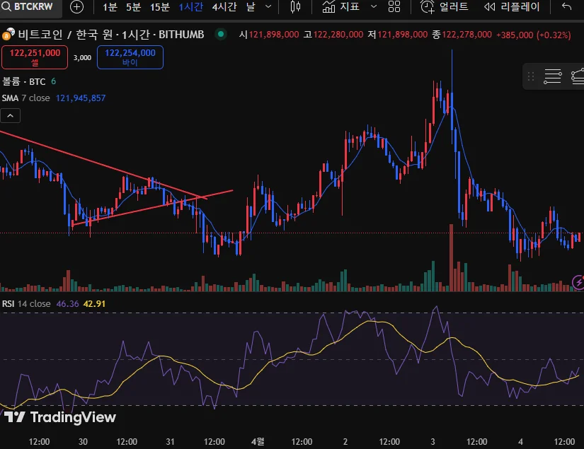 1시간봉은 현재 하향추세로 들어서고 있어서 곧 지지선을 터치하고 상향으로 올라갈 것으로 판단되어