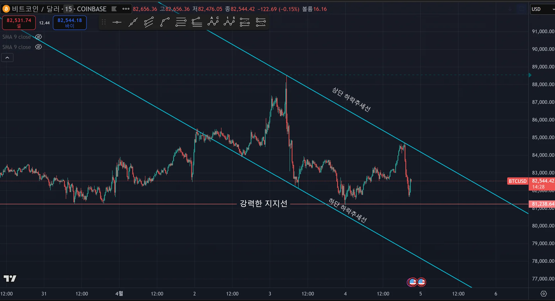 비트코인 15분봉으로 보았을 때 81200불 분홍색 지지선이 닿을때마다, 아니면 닿기 직전에 반등을 보여주는 모습을 여러번 보여주었으나, 다음에 상단 하락추세선에 닿았을때는 그 지지선을 뚫고 내려간다음, 하단 하락추세선(상단 추세선과 평행한 선)에 닿았을때 반등하지 않을까 싶습니다.