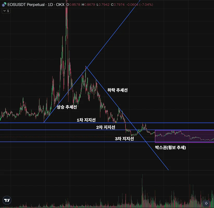이오스(EOS) 1일봉 차트 작도 후 캡처하여 올립니다.