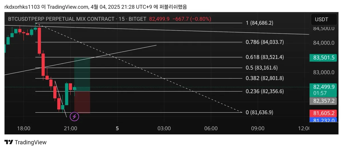 피보나치 236 뚫고 지지해주는 모습 보이길래 이전에 그어논 15분봉 상승추세선과 피보나치 618이 겹치는 부분까지는 상승해주겠다고 판단하여 진입
