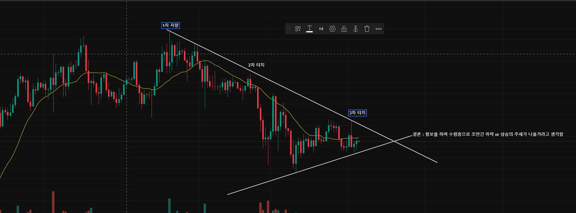 간단하게 작도를 해봤습니다. 현재 하락 추세 이후 저점을 계속 올려가고 있는 상황입니다 아래 지지 추세선 부분에 한번 더 터치를 해준다면 확실한 수렴으로 판단하고 있으며