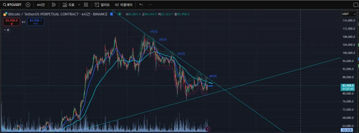 현재 는 하락추세선에 계속 저항을 받으면서 내려오는 모습입니다.