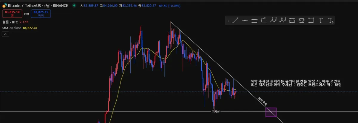 BTCUSDT 일봉 기준으로 지지선 및 추세선 작도 실습 진행하였습니다.