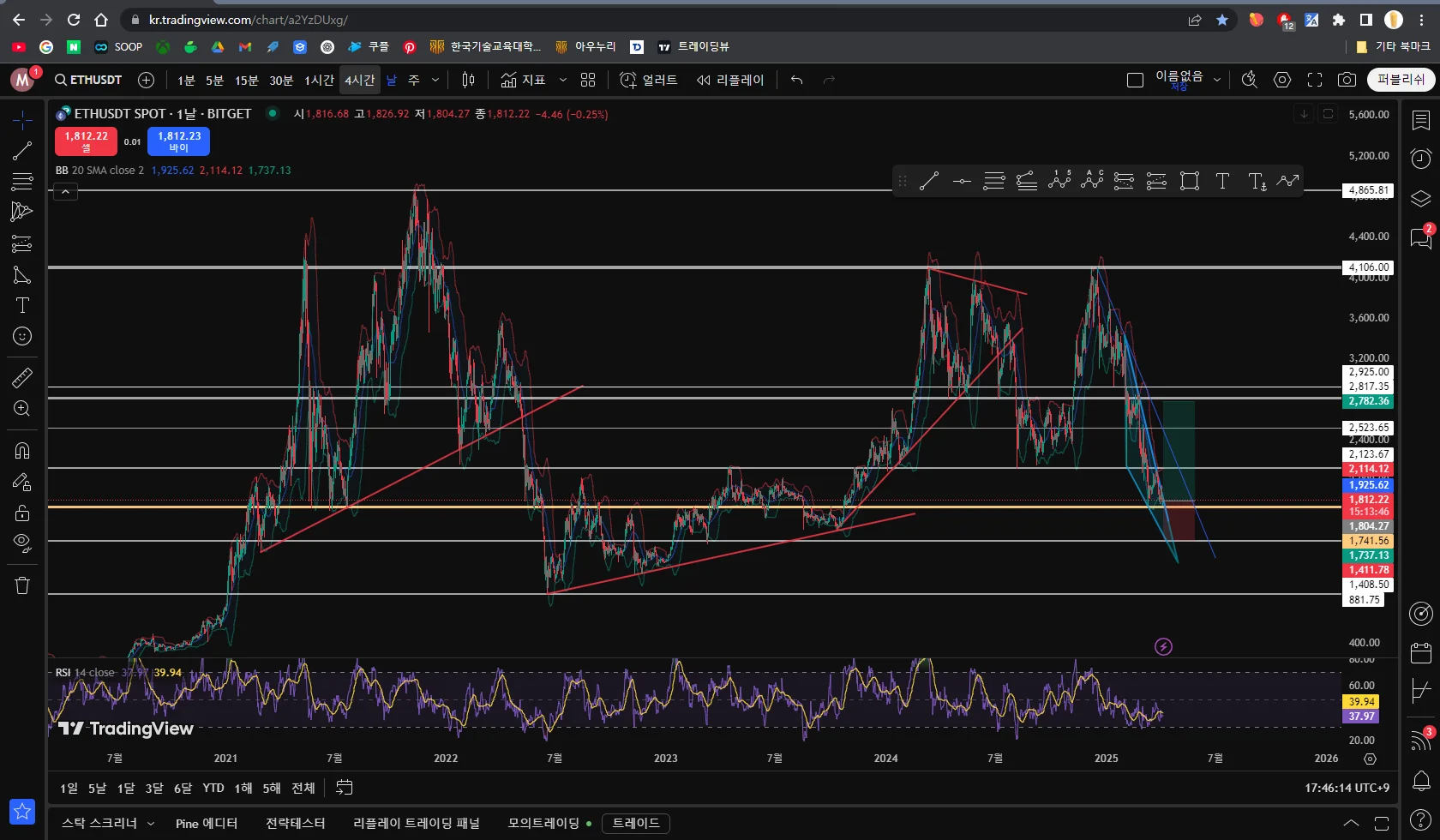 장기간에 걸친 하락 쐐기형 패턴과 몇년동안 유효한 지지저항 역할을 했던 노란색 가로선에 이미 2번 지지를 받았고 곧 탈출을 목전을 하고 있다. 또한 거래량도 점차 증가하면서 상승 가능성이 농후하므로 진입하였습니다
