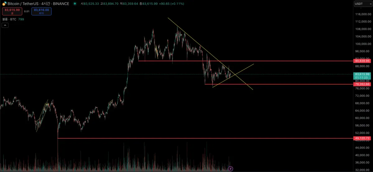 3개의 지지선과 1개의 단기 상승 추세선, 1개의 하락 추세선입니다