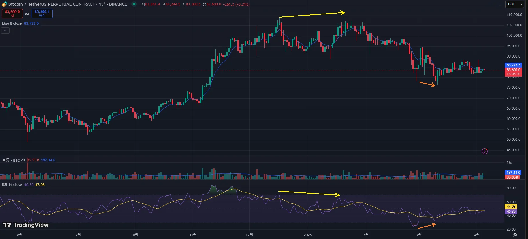 주황색 화살표: 25년도 최저점을 갱신하였지만, RSI는 상승하는 모습을 보여주고 있다. 이후로 상승랠리를 계속 이어나갈 수 있을지 없을지 과연.....