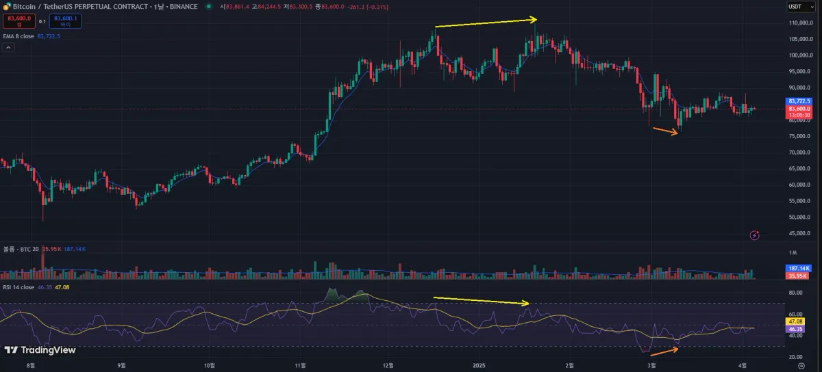 주황색 화살표: 25년도 최저점을 갱신하였지만, RSI는 상승하는 모습을 보여주고 있다. 이후로 상승랠리를 계속 이어나갈 수 있을지 없을지 과연.....