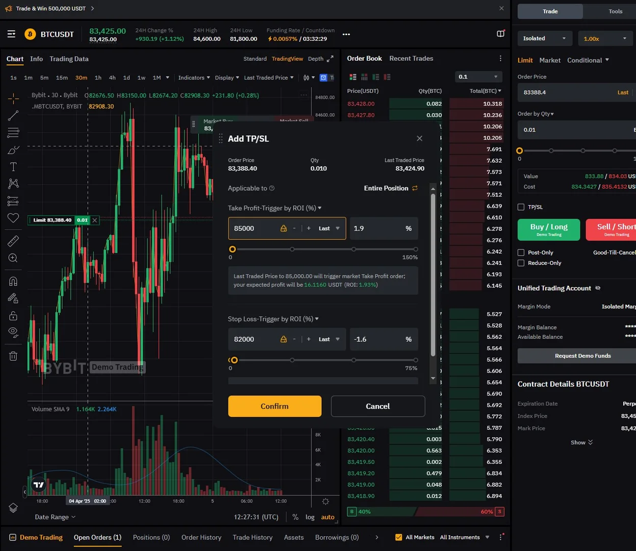 비트코인이 1시간봉 차트상 상승 추세에 있으며 추세선상 상승으로 보고 손절라인과 수익라인을 잡고 진입하였다.