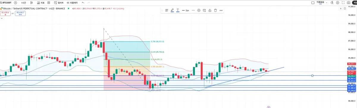 비트코인이 1시간봉 차트상 상승 추세에 있으며 추세선상 상승으로 보고 손절라인과 수익라인을 잡고 진입하였다.