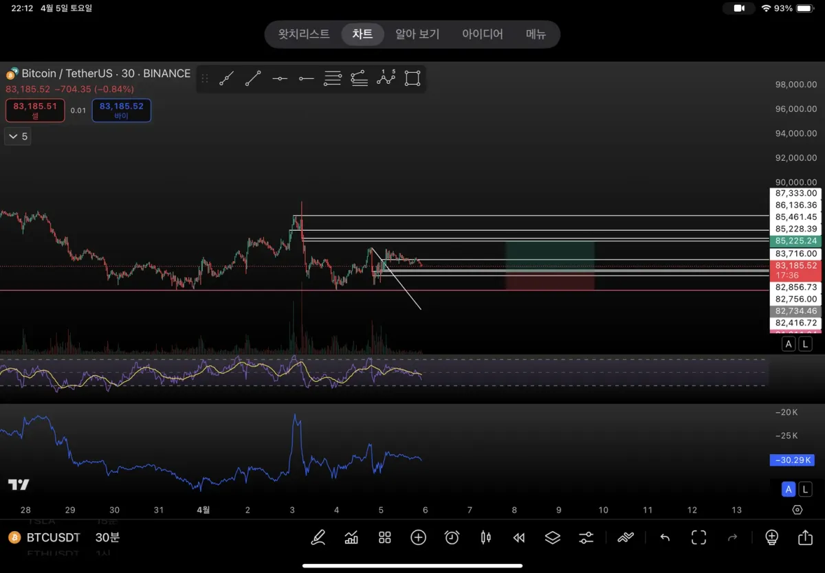 현재 과매도 구간으로 가까워지고 있으며 단기적으로 82,400구간에서 85,200까지 약반등 후 81,200 지지선을 깨고 빅숏이 나올 것 같습니다