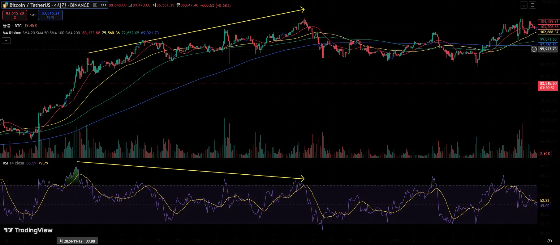 노란 화살표 기준으로, 캔들상 고점은 점점 높아지나 RSI 지수는 고점이 점점 낮아지는 형태를 보이며