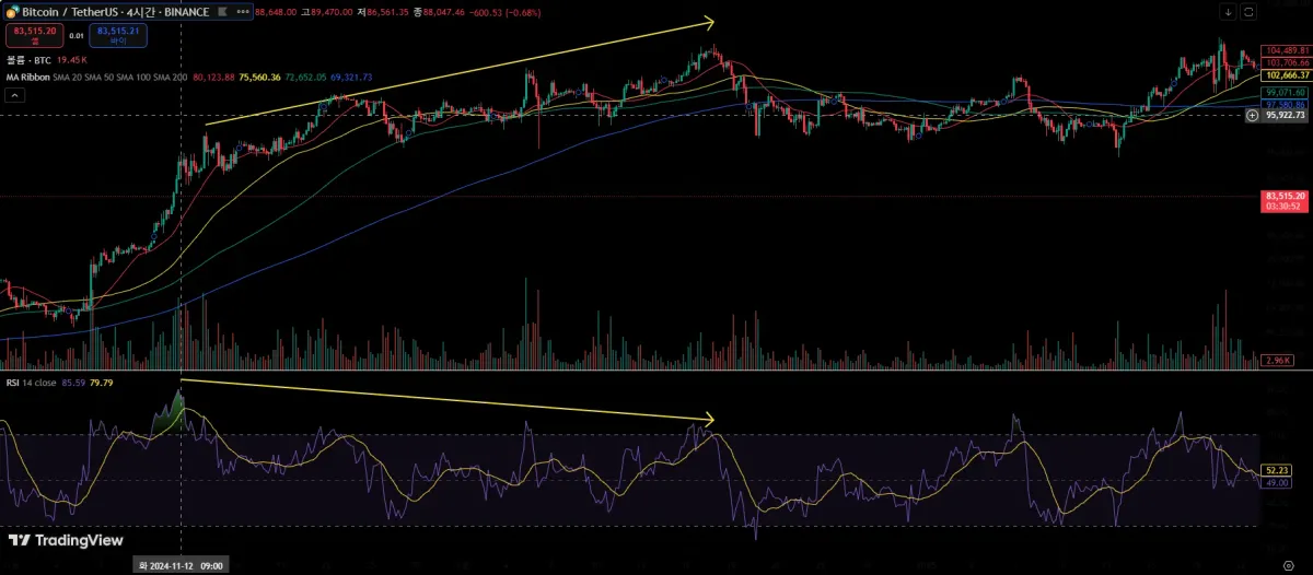 노란 화살표 기준으로, 캔들상 고점은 점점 높아지나 RSI 지수는 고점이 점점 낮아지는 형태를 보이며