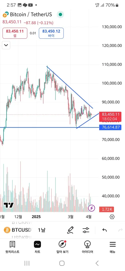 1일봉에서 지지선 저항선. 수평선. 추세를 그려봤습니다