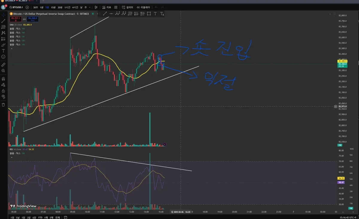 진입 근거는 상승다이버전스 구간에서 거래량은 감소하는 추세여서 큰 반등보다는 하락 다이버전스로 바뀌며 진행될거라 예상했습니다