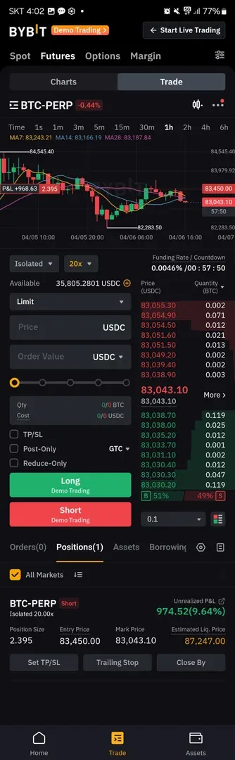 저항 매물대 부근 83450에서 숏포지션 진입하였으며, 목표가는 이전 반등 가격대인 82400으로 설정하였습니다.