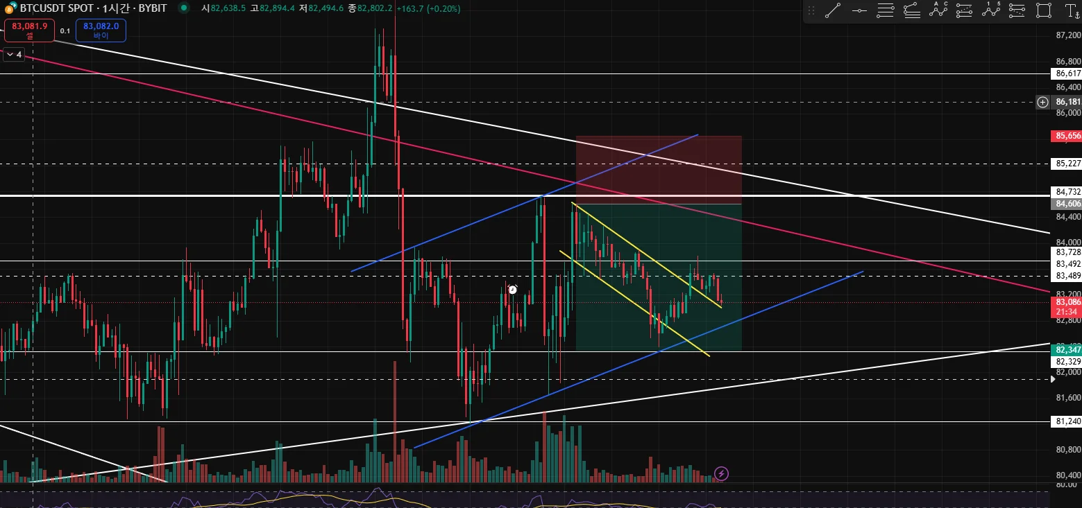 매수세가 강한건 아니라고 생각해서 저항선 약간 밑부분인 84600을 숏 진입시점으로 잡았고 체결이 됐습니다. 손절선은 일봉 하락 추세선 돌파 부근으로 잡았습니다.