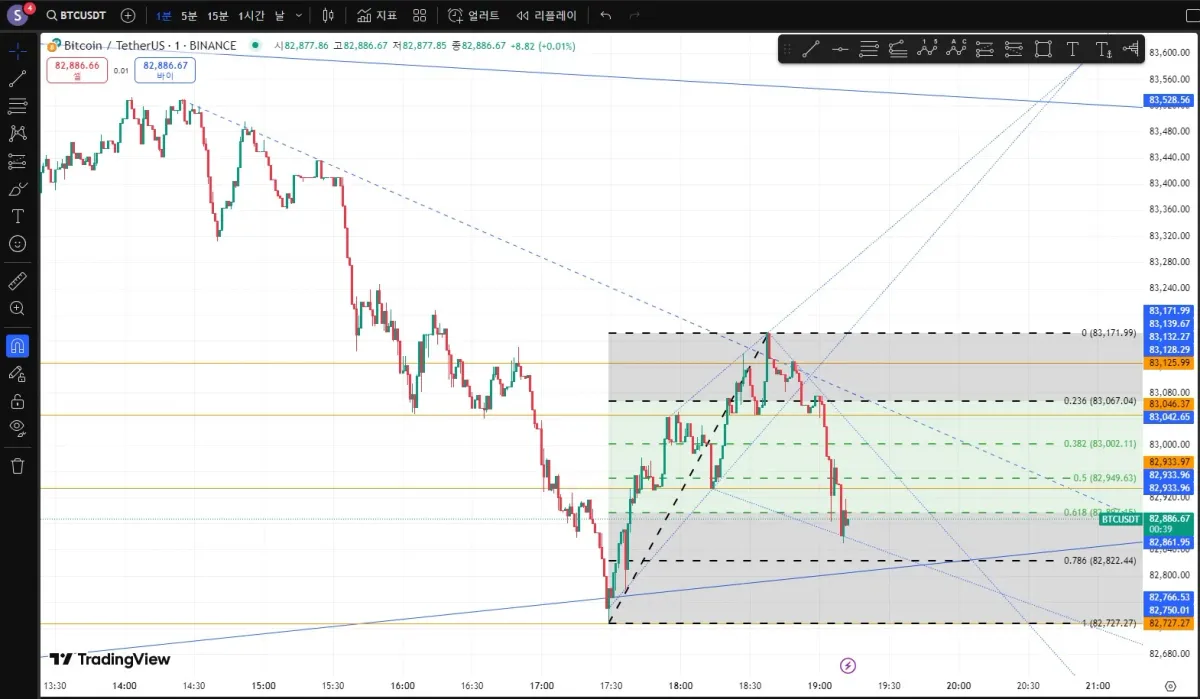 강사님의 15초봉 매매법을 보며 1분봉을 기준으로 시간봉 -> 15분봉 -> 5분봉 -> 1분봉 순서로 추세를 보며 매매중입니다.