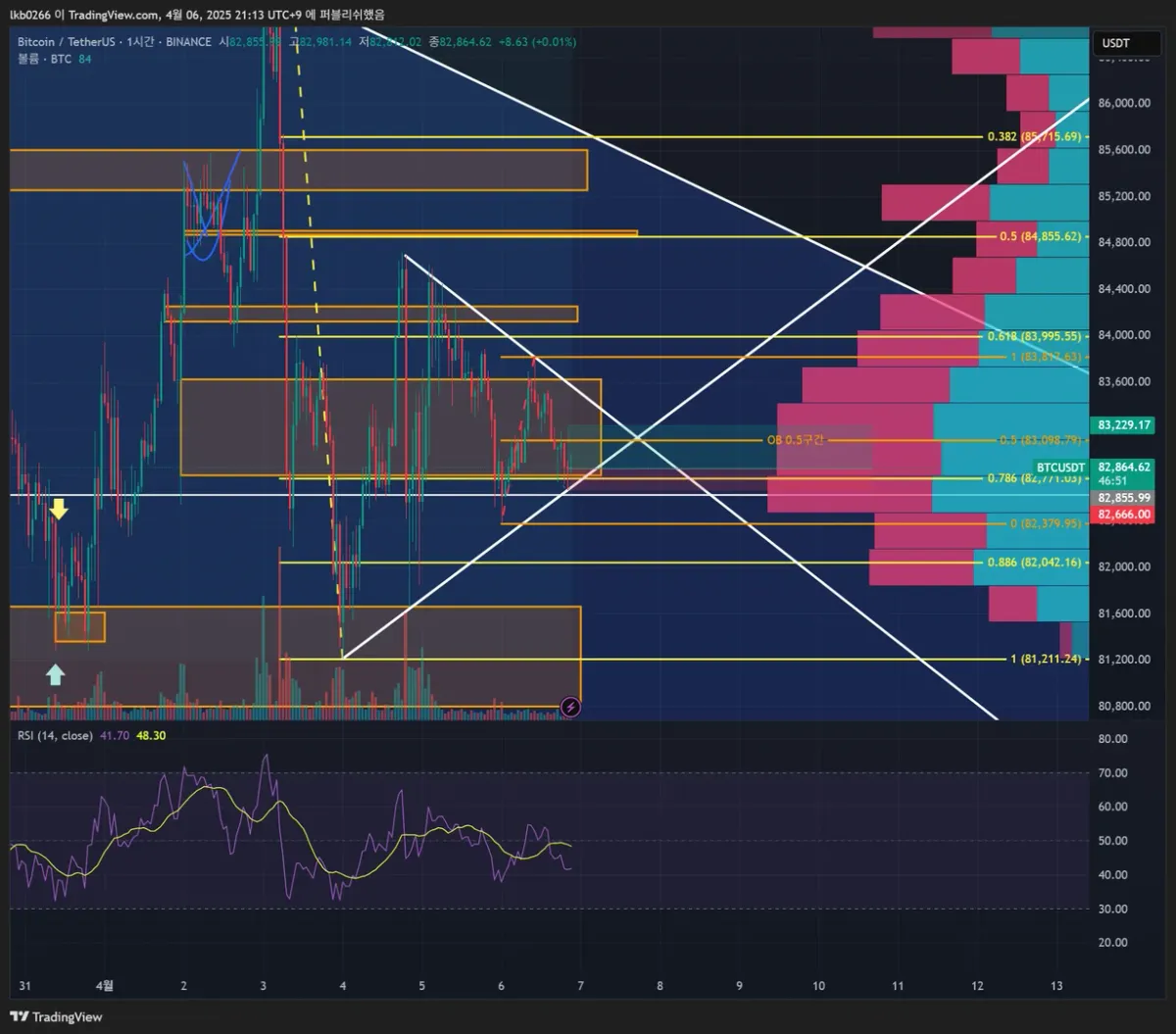 1차: 83,100(OB 저점, 고점 피보나치 0.5, 볼린저밴드 중단) 75%