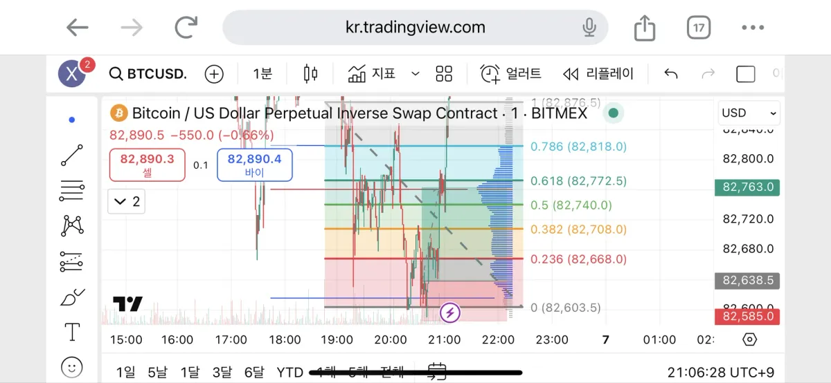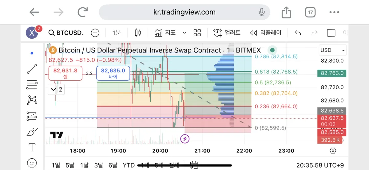 여기서 되돌림을 줄거같다는 판단을하고 0.618까지 목표가로 정하고 0의 조금 아래부분에 손절가를 정했습니다.