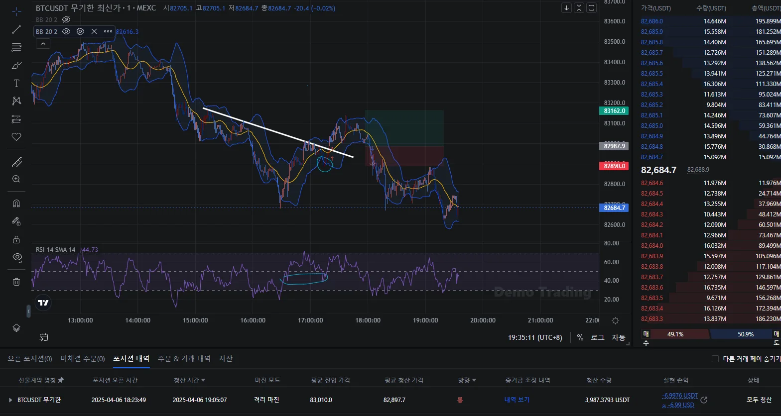 1 볼린저밴드 + 2 추세지속 rsi + 3 추세선 돌파로 매매했습니다. 손익비를 2:1로 설정했는데 목표까가지 못하고 설정해뒀던 스탑로스에 닿으면서 7달러 손실로 거래종료.