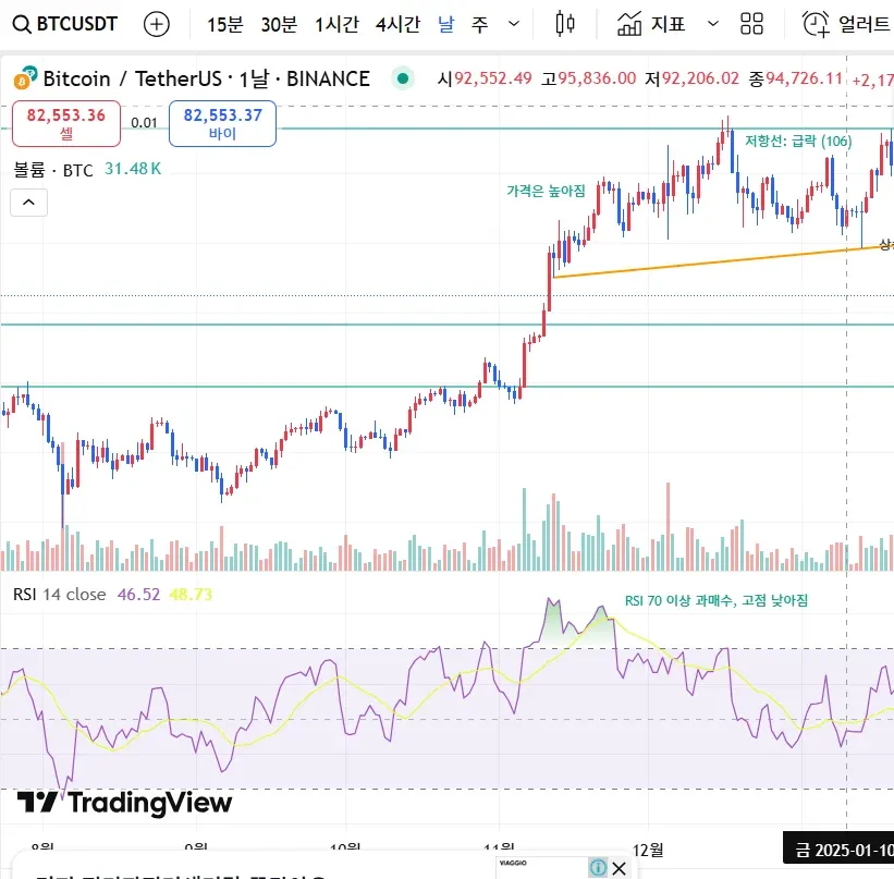 RSI 70이상 과매수 기간에서 가격은 올라가고 RSI 고점은 낮아지고 있어 하락 다이버전스가 이루어지고 있습니다.