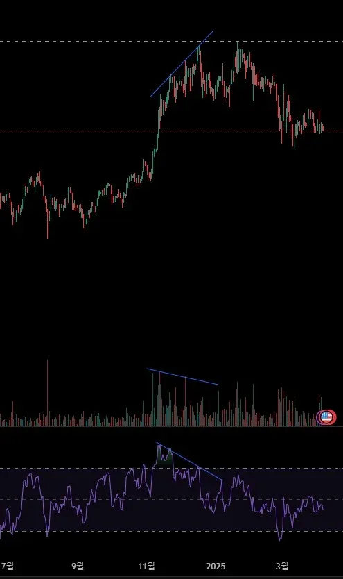 더이상 가격 고점을 높이지 못하고 거래량도 줄어들면서 추세가 하락으로 전환된것으로 판단됩니다.