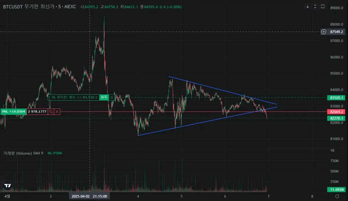 비트코인 5분봉 삼각수렴 하방돌파 확인 후 상단라인에 손절 걸고 숏 진입하여 수익 보았습니다.