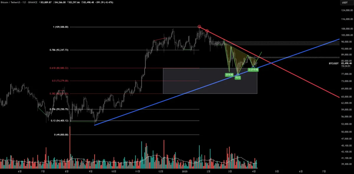 108K 부근 고점이 낮아지면서 다우이론에 의거해 하락 추세 출현.