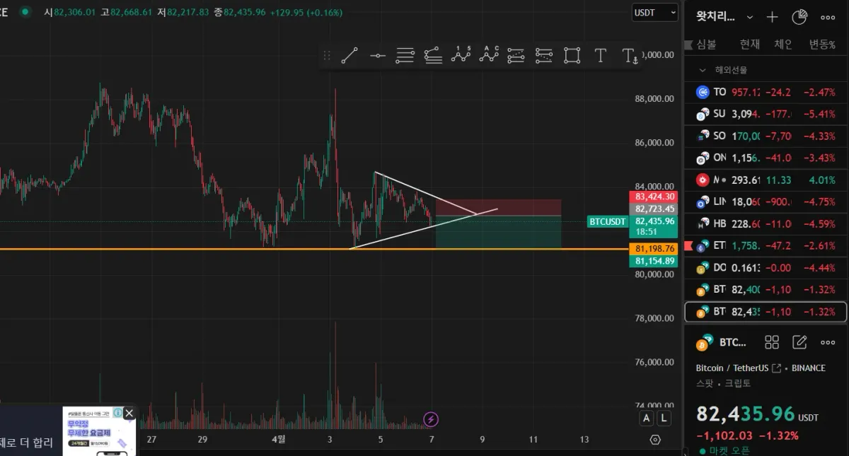 삼각 수렴인데 하단 구간을 여러번 두들겨준 상황에서 하락을 해 줄 것을 예측하여 82,800 달러에서 숏에 들어가 보았습니다. 위는 수렴 상단 부근인 83.4K에 손절 로스를 걸고, 아래로는 여러번 지지를 받아온 81.1K 구간을 1차로 보고 있기에, 81.1K에 반 익절을 걸어두고 추가 하락 하는지를 지켜볼 생각입니다.