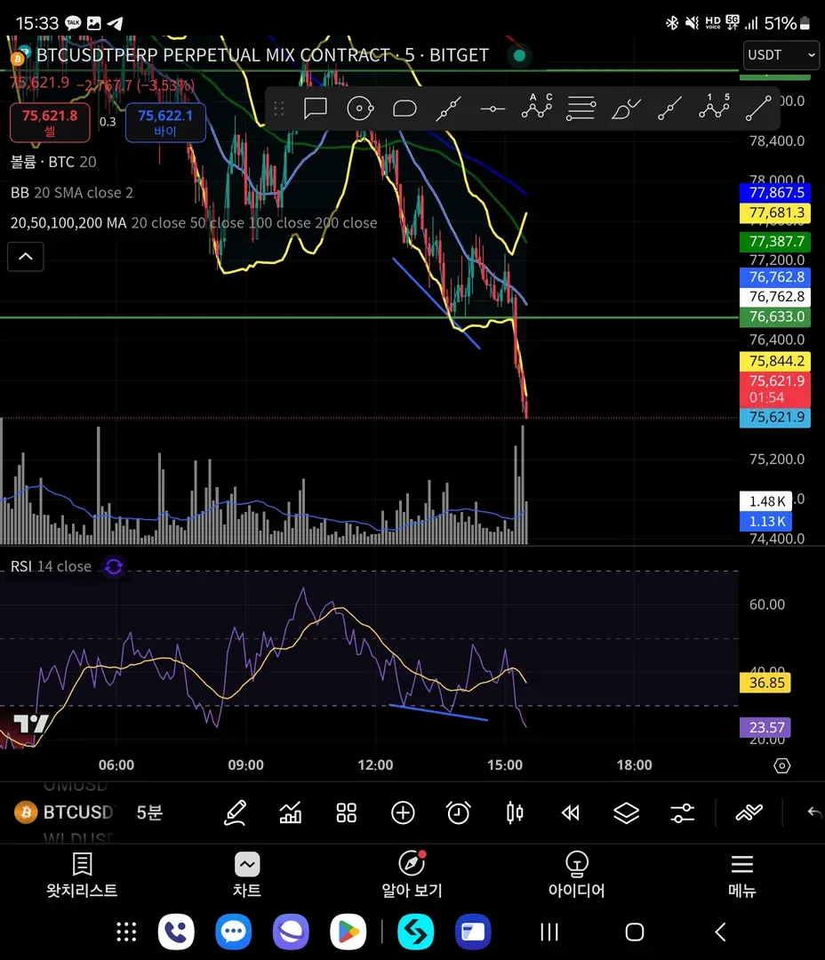 뚫린모습 확인후 76.2k 숏 진입 -> 단타개념으로 75.5까지 내려갈것으로 보고 75.7k 부근에서 안전하게 익절