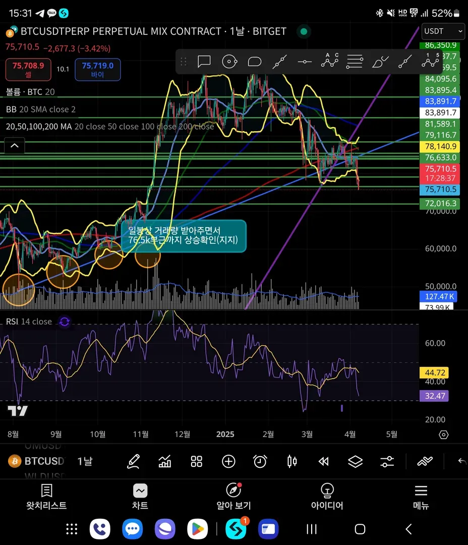 *76k가 뚫렸기때문에 일봉상 상승다이버젼스가 발생하려면 71-72k까지 내려가야 할것으로 보입니다