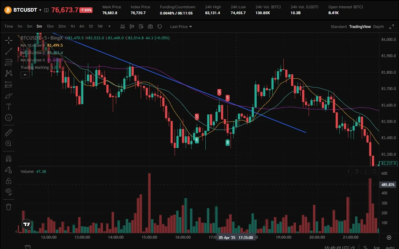 모의 트레이딩을 해보았습니다. 비트코인으로 5분봉 이평선과 추세선에서 저항 받을거라 예상하고 숏으로 진입 해서 수익이 났습니다.
