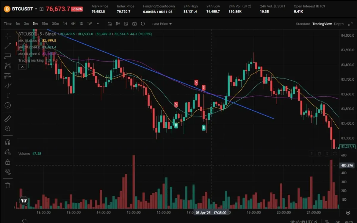 모의 트레이딩을 해보았습니다. 비트코인으로 5분봉 이평선과 추세선에서 저항 받을거라 예상하고 숏으로 진입 해서 수익이 났습니다.
