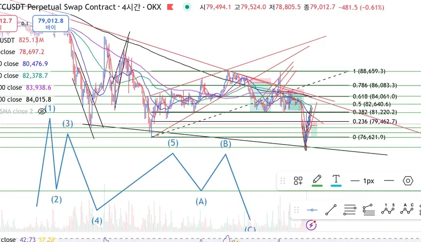 14. 삼각수렴 하단 추세선 이탈 확인 후/ 0.236 라인(79,462.7)을 하향 돌파하면, 1시간 봉 음봉에서 숏 진입