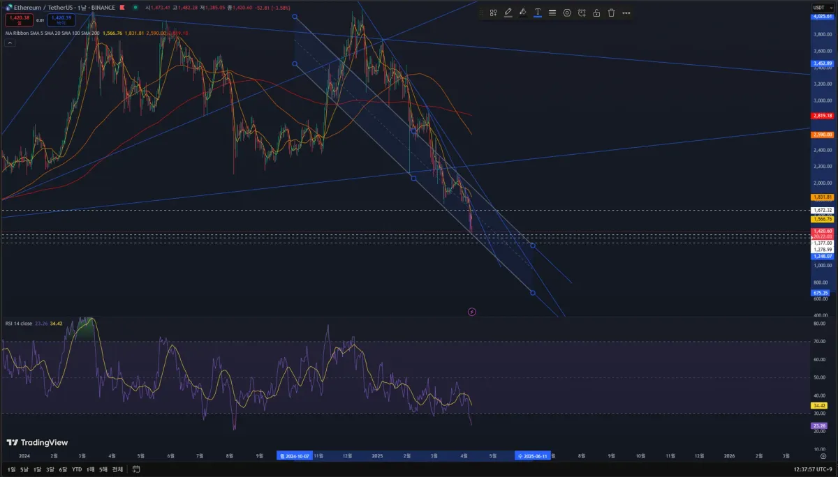 현재 차트 잘 작도하셨고, 하락 추세 채널과 주요 지지선에 주목하신 시선이 좋습니다. 아래에 구조적으로 조금 더 정리해서 설명드릴게요. 먼저 현재 차트에서 보이듯이 이더리움은 장기적인 하락 채널 안에서 움직이고 있고, 아직 채널 상단을 뚫지는 못한 상태입니다. 추세선을 기준으로 보면 고점과 고점을 연결한 하락 추세선이 명확하고, 저점과 저점을 연결한 하단 지지선도 잘 작도되어 있습니다. 여기서 중요한 건 이 하락 채널 안에서는 항상 저항에서 저점으로 흐르는 게 자연스러운 구조라는 점입니다. 지금처럼 RSI가 과매도권에 진입하고 있고, 가격도 하단 채널 및 과거 지지선에 가까워지고 있다면 단기 반등을 노려볼 수는 있습니다. 다만, 반등이 곧 추세 전환은 아니라는 점을 기억하셔야 합니다. 그래서 진입을 고민하신다면 '구조 속 단기 반등'에 무게를 두고 접근하는 게 좋습니다. 말씀하신 1377부근, 1278부근은 과거 여러 번 반응했던 지점으로 보이고, 해당 구간은 과거의 저점 지지였던 만큼 다시 한 번 반응이 나올 가능성이 있습니다. 하지만 중요한 것은 진입 전에 반드시 그 구간에서 어떤 반응이 나오는지를 확인하는 것입니다. 예를 들어 아래 조건들을 체크해보세요: 해당 지점에서 RSI가 과매도권 해소되며 돌아나오는 흐름인지 거래량이 실리며 양봉이 만들어지고 있는지 하위 시간봉(4시간, 1시간 등)에서 박스권 돌파나 하락쐐기형 상단 이탈이 나오는지 이런 조건들이 충족된다면 해당 구간에서 부분 진입을 시도해보고, 반등이 확인되면 추가 진입을 계획하는 전략이 유효합니다. 처음부터 강한 비중으로 들어가기보다는, 구조가 완전히 전환되기 전까지는 분할 접근을 추천드립니다.