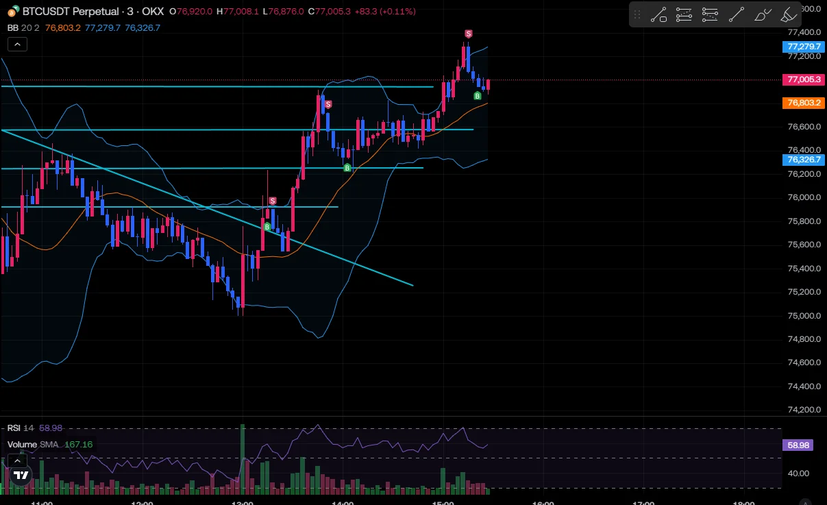 블밴 상단과 RSI 과매수 상태 확인 후 숏 진입. 2차례 실시 하였고,