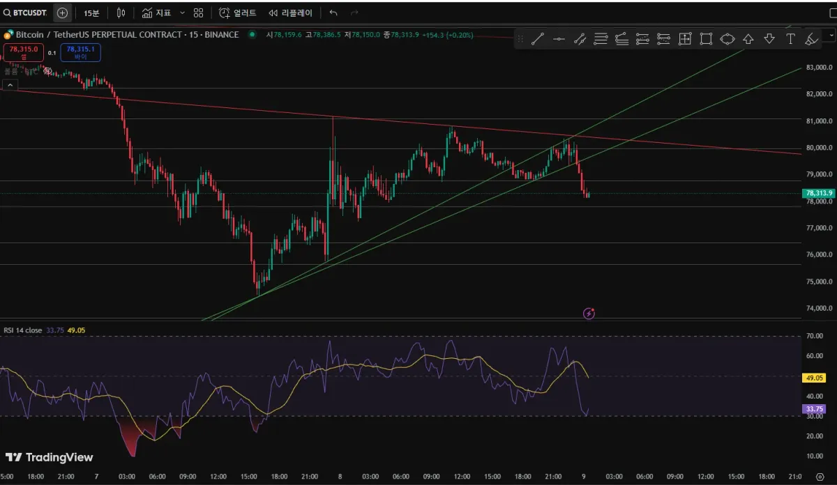 상승추세선 이탈조짐이 보여 지지저항 구간에서 매도포지션 잡았고 포지션 종료는 rsi 과매도 구간해서 하였습니다.