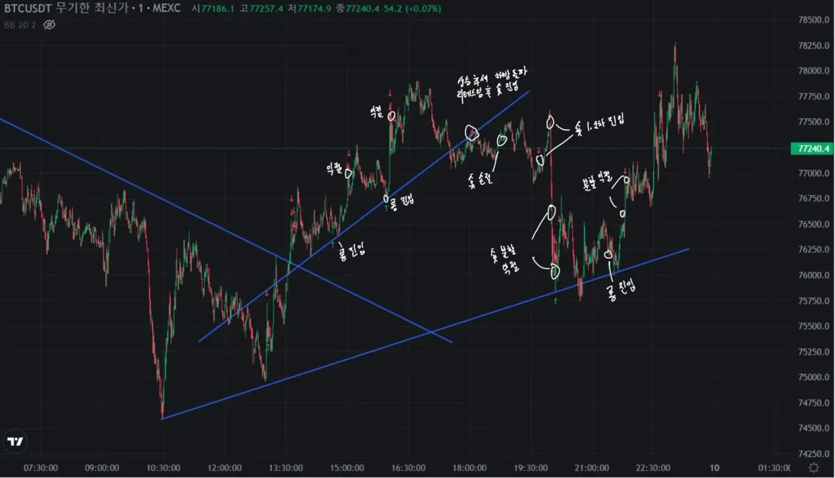 전일의 하락추세선이 강하게 상승돌파된 후 조정을 받은 지점부터 상승추세선을 긋고 추세선이 하방 돌파되었다고 판단될 만한 지점에 손절을 설정하고 두번의 롱 진입으로 수익을 냈습니다.