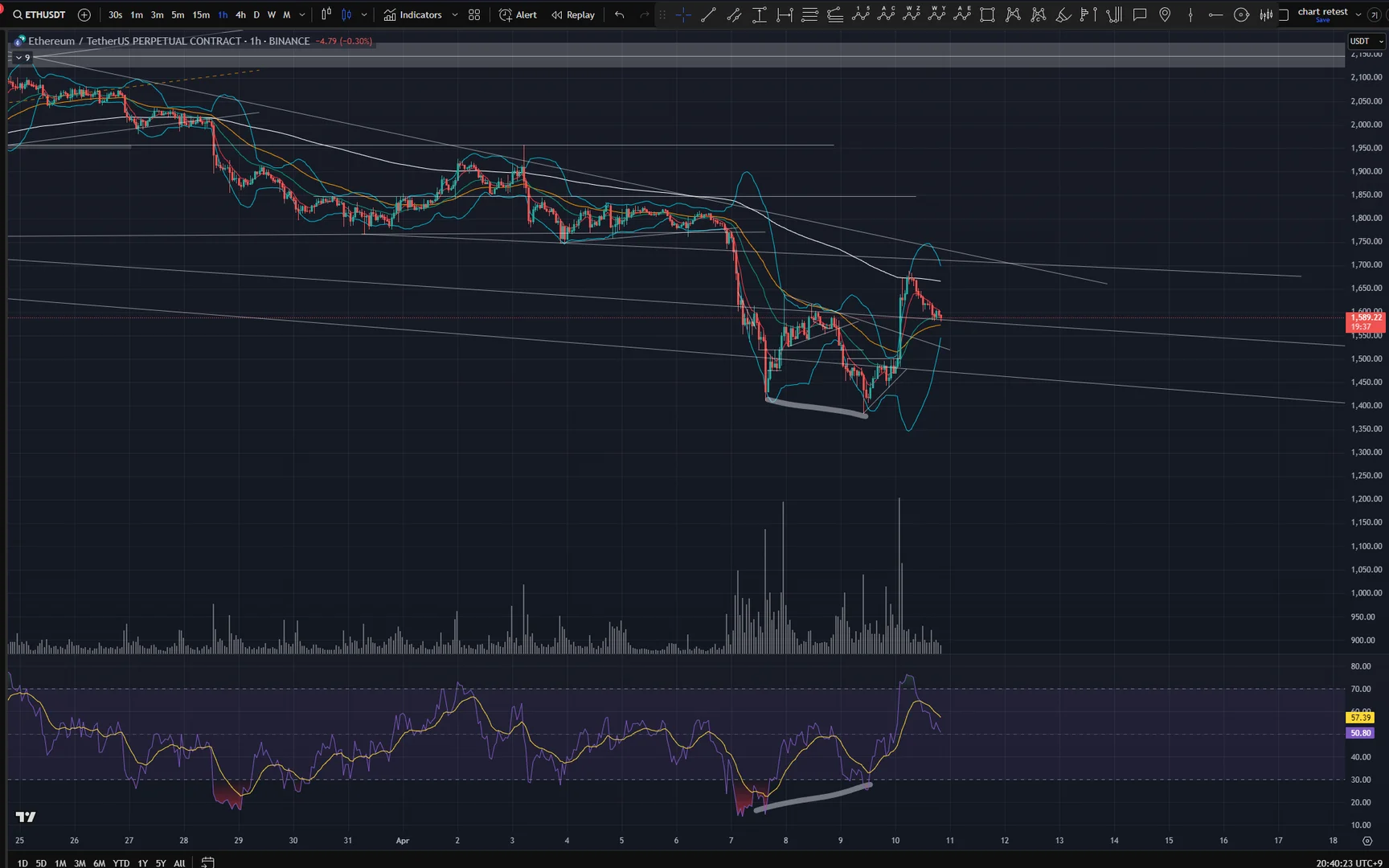 4월 7일 이더리움이 바닥을 찍은 후 9일에 더 낮은 바닥을 찍었지만 rsi는 7일에 비해 올라간 모습을 보여주고 있다