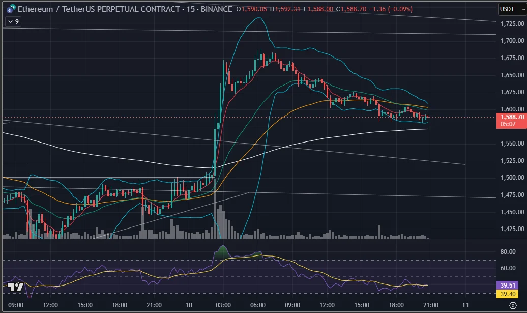 어제 9일 트럼프발 관세 유예 정책이 발표되면서 어마어마한 상승이 나온 이후의 모습을 보여주는 15분봉 차트이다