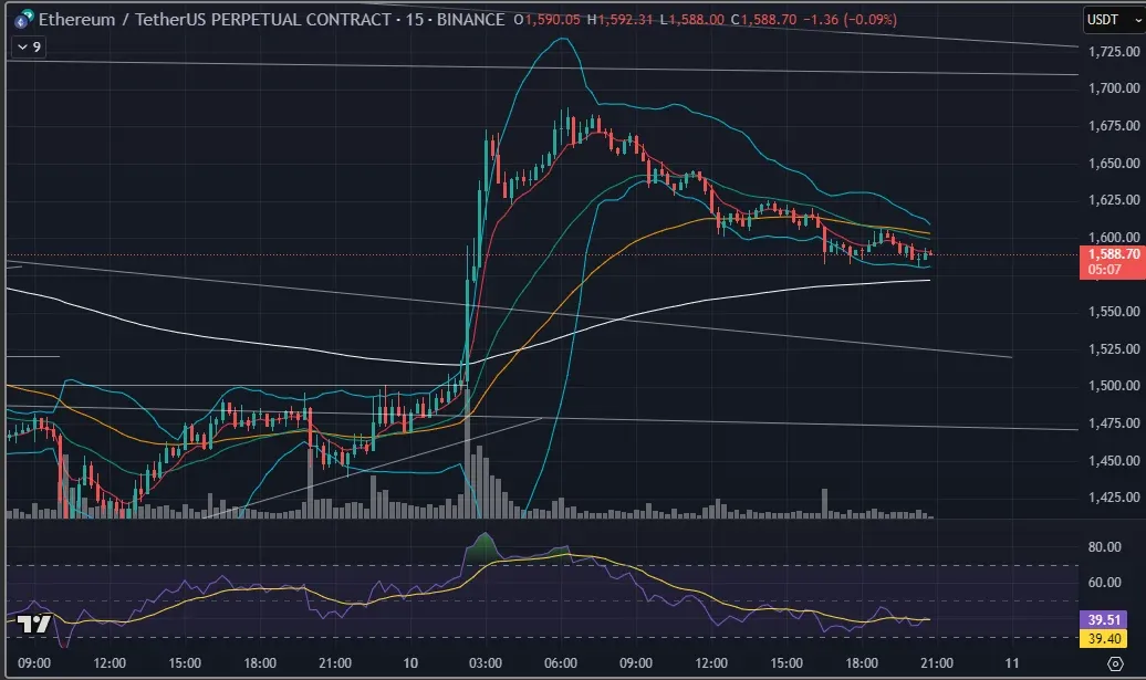 어제 9일 트럼프발 관세 유예 정책이 발표되면서 어마어마한 상승이 나온 이후의 모습을 보여주는 15분봉 차트이다
