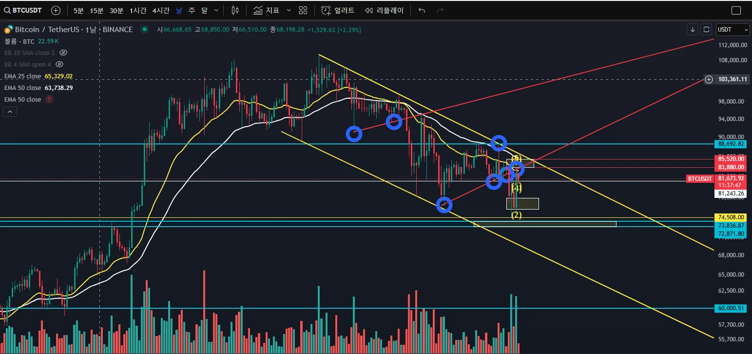 74k부근( 전 고점)에서 거래량과 더불어 반등세가 나온걸로 보아 중요 지지구간을 미리 작도해둔상태로 단기 트레이딩에 임하고있습니다.