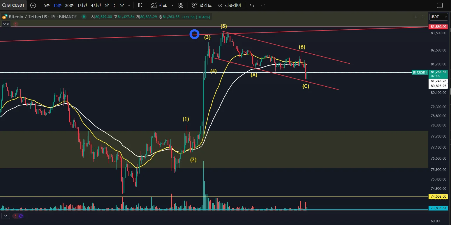유의미한 저항은 현재는 빨간색저항이자 전고점대인 83,800~83,900에서의 저항돌파이냐 아니면 다시 저항이냐에 따라 포지션 정리가 필요하지않나 생각이 듭니다.
