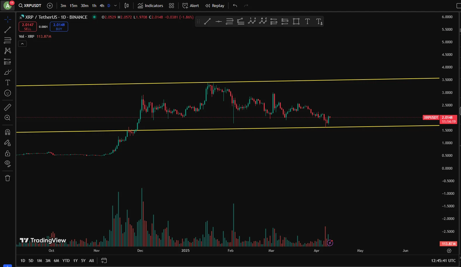 리플 일봉상 고점이였던 부분들을 이어 추세선을 그려 2025년도 부근으로 차트를 당겨 추세를 확인해보았습니다. 아직 작도하는 것이 익숙하지 않아서 정확하게 맞는지는 모르겠지만 지지와 저항을 받고 있는 것으로 보여집니다!