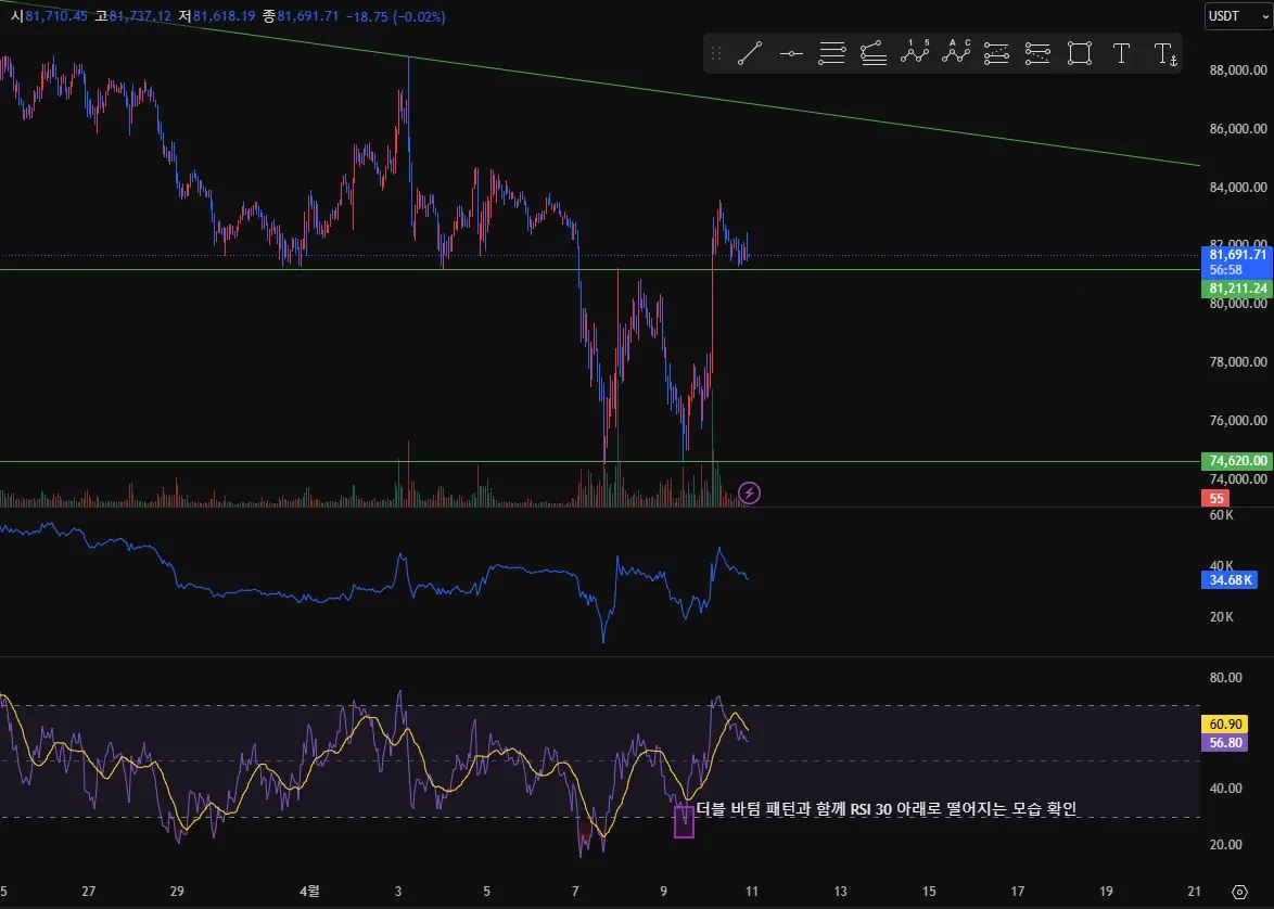 비트코인 차트에 RSI 지표 추가 후 음봉과 함께 RSI 30 깨지는 부분 확인 진행하였습니다.